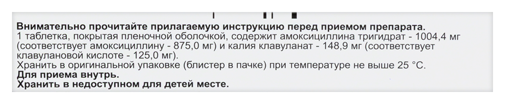 - УпаковкаТаблетки, покрытые пленочной оболочкой, 875 мг+125 мг - 14 шт с инструкцией по медицинскому применению в уп