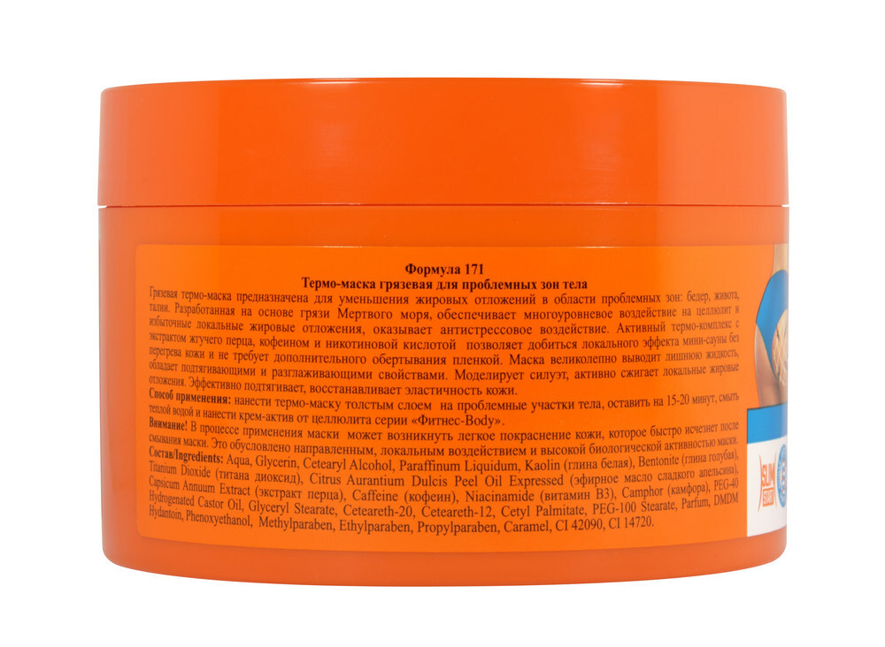 Грязевая термо-маска предназначена для уменьшения жировых отложений в области проблемных зон: бедер, живота, талии. Разработанная на основе грязи Мертвого моря обеспечивает многоуровневое воздействие на целлюлит и избыточные локальные жировые отложения, оказывает антистрессовое воздействие. Активный термо-комплекс с экстрактом жгучего перца, кофеином и никотиновой кислотой позволяет добиться локального эффекта мини-сауны без перегрева кожи и не требует дополнительного обертывания пленкой. Маска великолепно выводит лишнюю жидкость, обладает подтягивающими и разглаживающими свойствами.