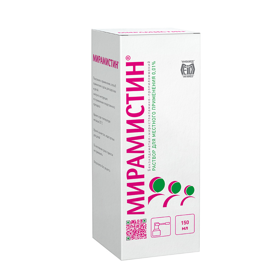 - Способ применения и дозыВсегда применяйте препарат в полном соответствии с листком-вкладышем или с рекомендациями лечащего врача. При появлении сомнений посоветуйтесь с лечащим врачом. Рекомендуемая доза Оториноларингология • Тонзиллиты, фарингиты, ларингиты: 3-4-кратное нажатие на головку насадки-распылителя или 10-15 мл на одно полоскание 3-4 раза в сутки. • При остром и хроническом наружном отите: в наружный слуховой проход с помощью пипетки закапывают до 5 капель препарата 4 раза в сутки или вместо закапывания в наружный слуховой проход аккуратно вводят марлевую турунду, смоченную препаратом, 4 раза в сутки. Курс лечения - 10 дней. • При гайморитах: во время пункции верхнечелюстная пазуха промывается достаточным количеством препарата. Длительность терапии составляет от 4 до 10 дней в зависимости от сроков наступления ремиссии. Стоматология • При стоматитах, гингивитах, пародонтитах рекомендуется полоскание ротовой полости 10-15 мл препарата 3-4 раза в сутки. В случае невозможности полоскания допускается местное применение марлевых или ватных тампонов, смоченных раствором препарата. Хирургия, травматология, комбустиология • С целью лечения и профилактики вторичного инфицирования ран: поверхность раны орошают препаратом; марлевые тампоны, смоченные препаратом, фиксируют на поверхности раны; в случае необходимости возможно тампонирование раны и/или свищевых ходов во время выполнения хирургических манипуляций; возможно проведение активного дренирования ран и/или полостей. Суточный расход препарата составляет до 1 л препарата. • Акушерство, гинекология • Профилактика и лечение нагноений послеродовых травм, ран промежности и влагалища, послеродовых инфекций: препарат применяется в виде влагалищных орошений до родов (5-7 дней), в родах (после каждого влагалищного исследования). В послеродовом периоде препарат вводят с помощью тампонов, смоченных 50 мл препарата, на 2 часа ежедневно в течение 5 дней. • При родоразрешении женщин путем кесарева сечения непосредственно перед операцией обрабатывают влагалище, во время операции - полость матки и разрез на ней, а в послеоперационном периоде вводят тампоны, смоченные препаратом Мирамистин®, на 2 часа ежедневно в течение 7 дней. • Лечение воспалительных заболеваний проводится курсом в течение 2 недель путем внутривлагалищного введения тампонов с препаратом Мирамистин®, а также методом лекарственного электрофореза. • Комплексное лечение воспалительных заболеваний в гинекологии (вульвовагинит): в виде влагалищных орошений или введения тампона, смоченного препаратом Мирамистин®, на 2 часа ежедневно в течение 7-14 дней (продолжительность лечения и кратность введения определяются по назначению врача). Для удобства влагалищного орошения рекомендуется использование гинекологической насадки. Содержимое флакона с помощью гинекологической насадки ввести во влагалище и произвести орошение. Дерматология • Лечение и профилактика пиодермий и дерматомикозов, кандидозов кожи и слизистых оболочек, микозов стоп: препарат наносят на пораженный участок кожи путем протирания стерильными марлевыми тампонами, обильно смоченными препаратом. Препарат применяется 3 раза в день на пораженных участках кожи. Венерология • Профилактика заболеваний, передающихся половым путем: применение преп