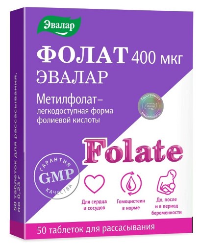 Компания «Эвалар» разработала «Фолат 400 мкг» - препарат с оптимальным содержанием активной формы фолиевой кислоты с высокой биодоступностью - метилфолата, в форме таблеток для рассасывания. В отличие от обычной фолиевой кислоты, метилфолат легче усваивается и начинает действовать гораздо быстрее.