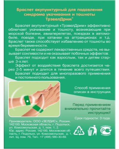 Эффективно предотвращают укачивание и тошноту, возникающие при: морской болезни, авиаперелетах, поездках в автомобиле, поезде, при катании на аттракционах. Эффективность акупунктурных браслетов ТрэвелДрим® основана на древнем нелекарственном методе китайской медицины - акупрессуре (точечном массаже).