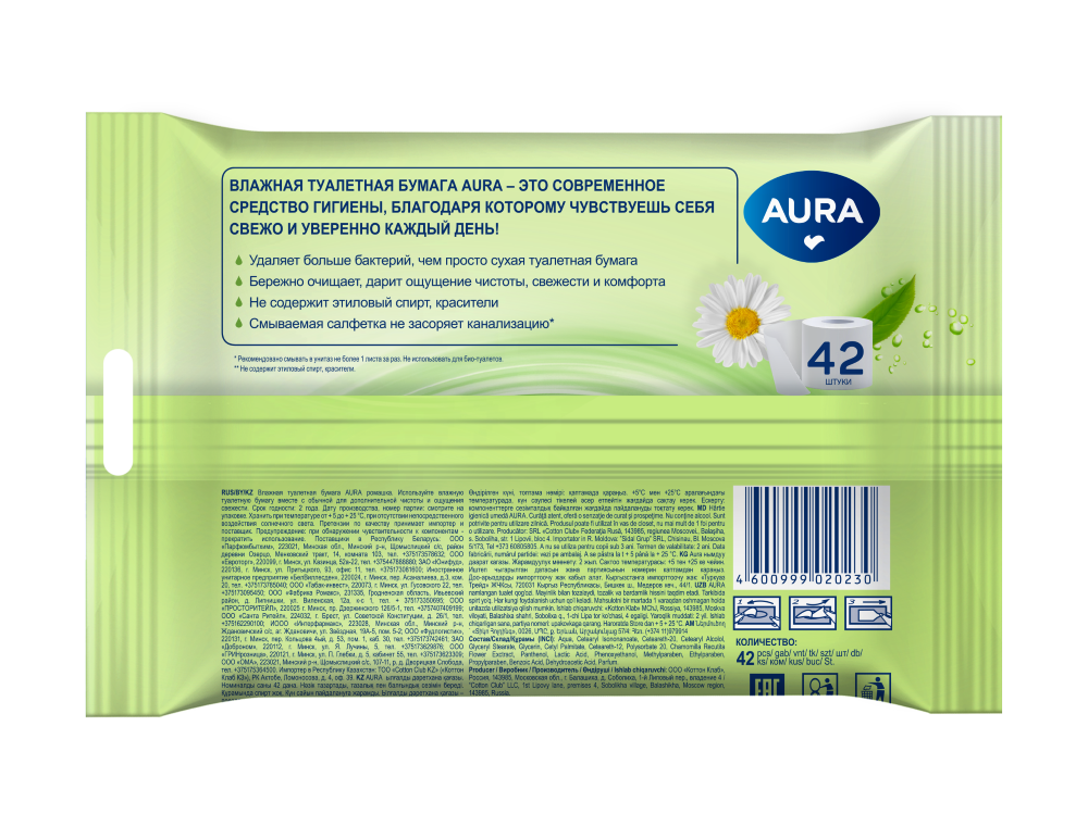 AURA БУМАГА ТУАЛЕТНАЯ ВЛАЖНАЯ РОМАШКА - бережно очищает кожу, дарит ощущение чистоты, свежести и комфорта.