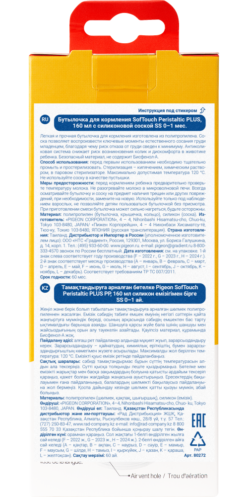 PIGEON SOFTOUCH PERISTALTIC PLUS БУТЫЛОЧКА ДЛЯ КОРМЛЕНИЯ ПОЛИПРОПИЛЕН - для кормления грудных младенцев