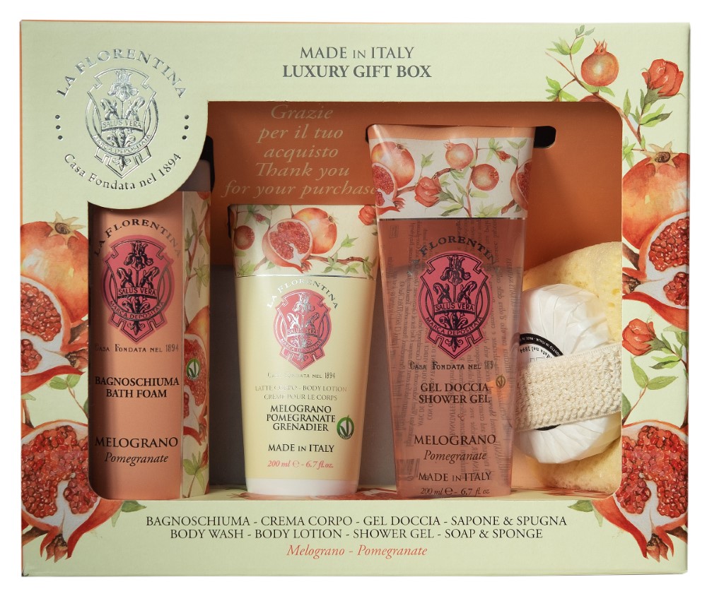LA FLORENTINA НАБОР ГРАНАТ/ПЕНА Д/ВАННЫ 500МЛ+ЛОСЬОН Д/ТЕЛА 200МЛ+ГЕЛЬ Д/ДУША 200МЛ+МЫЛО 115,0+СПОНЖ ДЛЯ ТЕЛА/ - роскошные наборы La Florentina - это ваш душистый, красивый островок Италии и идеальный подарок для близких и любимых.