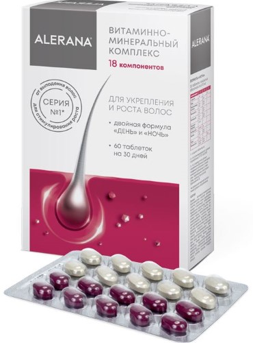 Витаминно-минеральный комплекс АЛЕРАНА® является дополнительным источником витаминов, аминокислот и минеральных веществ (макро- и микроэлементов), необходимых для укрепления и роста здоровых волос, для предотвращения выпадения и сечения волос, а также для улучшения состояния кожи головы у женщин и мужчин. Активные компоненты формул витаминно-минерального комплекса АЛЕРАНА® «День» и «Ночь» подобраны с учётом совместимости и синергетического действия всех активных компонентов.Витаминно-минеральный комплекс АЛЕРАНА® является дополнительным источником витаминов, аминокислот и минеральных веществ (макро- и микроэлементов), необходимых для укрепления и роста здоровых волос, для предотвращения выпадения и сечения волос, а также для улучшения состояния кожи головы у женщин и мужчин. Активные компоненты формул витаминно-минерального комплекса АЛЕРАНА® «День» и «Ночь» подобраны с учётом совместимости и синергетического действия всех активных компонентов.
