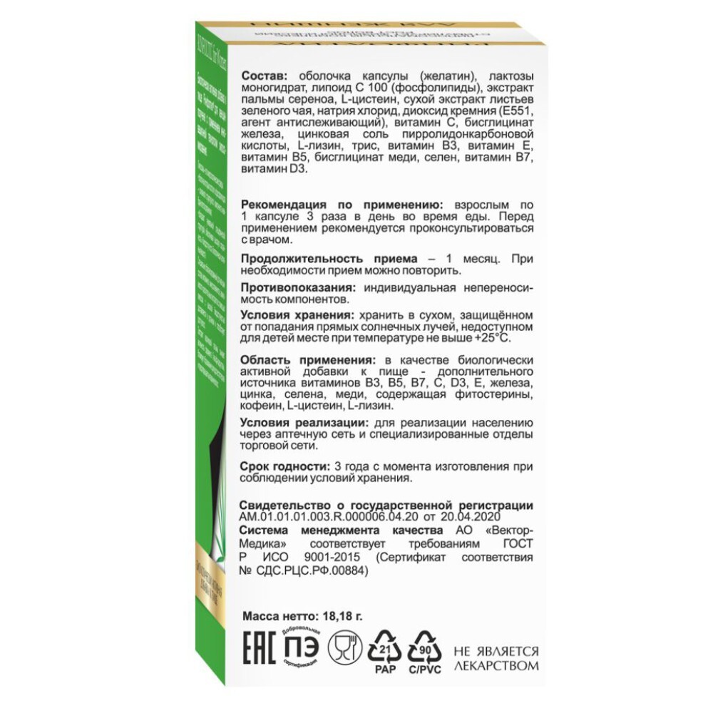 Экстракт пальмы сереноа, L-цистеин, сухой экстракт листьев зеленого чая, витамин С, бисглицинат железа, цинк PCA, L-лизин, витамин B3, витамин Е, витамин B5, бисглицинат меди, селен, витамин B7, витамин D3.