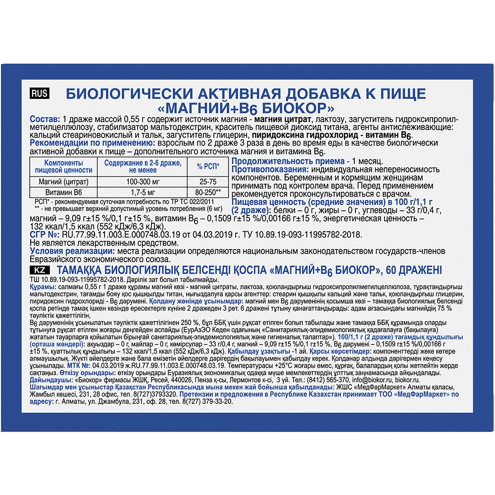 Основой «Магний+В6 Биокор» является цитрат магния, который является органической и хорошо растворимой формой магния, это в значительной степени обуславливает его высокую биоусвояемость в организме.