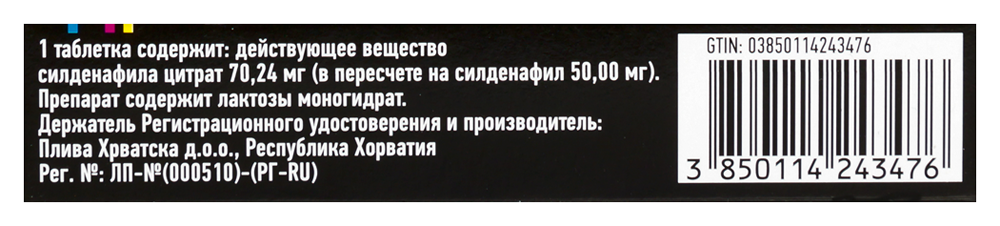 - Состав1 таблетка содержит: действующее вещество силденафила цитрат 70,24 мг (в пересчете на силденафил 50,00 мг); вспомогательные вещества: целлюлоза микрокристаллическая (PH 101) 205,76 мг; кроскармеллоза натрия 10,50 мг; гипролоза (гидроксипропилцеллюлоза) 9,00 мг; кремния диоксид коллоидный (кремния диоксид коллоидный безводный) 1,50 мг; магния стеарат 3,00 мг; пленочная оболочка: Опадрай II 31F58914 белый (гипромеллоза (Е 464), лактозы моногидрат, титана диоксид (Е 171), макрогол-4000, натрия цитрата дигидрат (Е 331))11,91 мг, индигокармин (Е 132) 0,09 мг