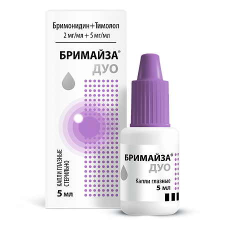 Препарат Бримайза Дуо – комбинированное лекарственное средство, содержащее в своем составе 2 действующих вещества: бримонидин – адреномиметик, оказывающий стимулирующее действие на альфа2-адренорецепторы, и тимолол – блокатор бета-адренорецепторов. Оба действующих вещества снижают внутриглазное давление (ВГД) за счет сочетанного взаимодействия, приводя к значительно более выраженному гипотензивному эффекту по сравнению с эффектом каждого из компонентов в отдельности. Бримонидин – агонист альфа-адренергических рецепторов, причем он обладает в 1000 раз большей селективностью в отношении альфа2-адренорецепторов по сравнению с альфа1-адренорецепторами. Селективность выражается в отсутствии мидриаза и вазоконстрикции сосудов микроциркуляторного русла. Гипотензивное действие бримонидина обеспечивается за счет снижения образования внутриглазной жидкости и повышения ее оттока по увеосклеральному пути.