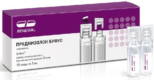 - Способ применения и дозыВнутривенно (капельно или струйно), внутримышечно. Внутривенно препарат Преднизолон буфус обычно вводят сначала струйно, затем капельно. Доза препарата и продолжительность лечения устанавливается врачом индивидуально в зависимости от показаний и тяжести заболевания. При острой надпочечниковой недостаточности препарат вводят в начальной разовой дозе от 90-120 мг до 180 мг, суточная доза составляет 300-390 мг. При тяжелых аллергических реакциях препарат Преднизолон буфус вводят в суточной дозе от 90-120 мг до 180 мг в течение 3-16 дней. При бронхиальной астме препарат Преднизолон буфус вводят в зависимости от тяжести заболевания и эффективности комплексного лечения от 60-90 мг до 660 мг на курс лечения от 3 до 16 дней; в тяжелых случаях доза может быть увеличена до 1380 мг на курс лечения и более, с постепенным снижением дозы. При астматическом статусе препарат Преднизолон буфус вводят в дозе 510-1200 мг в сутки с последующим снижением до 300 мг в сутки и переходом на поддерживающие дозы. При тиреотоксическом кризе рекомендуемая начальная доза препарата Преднизолон буфус 90-120 мг; суточная доза – 300 мг. При необходимости суточная доза может быть увеличена до 900 мг. Длительность введения зависит от терапевтического эффекта, обычно до 6 дней. При шоке, резистентном к стандартной терапии, препарат Преднизолон буфус в начале терапии обычно вводят струйно, после чего переходят на капельное введение. Если в течение 10-20 минут артериальное давление не повышается, повторяют струйное введение препарата. После выведения из шокового состояния продолжают капельное введение до стабилизации артериального давления. Начальная разовая доза составляет 60-150 мг в тяжелых случаях – до 390 мг. Повторно препарат вводят через 3-4 часа. Суточная доза может составлять 300-1200 мг с последующим снижением дозы. При острой печеночно-почечной недостаточности (при острых отравлениях, в послеоперационном и послеродовом периодах и другое) препарат Преднизолон буфус вводят по 30-90 мг в сутки; при наличии показаний суточная доза может быть увеличена до 300-1500 мг в сутки и выше. При ревматоидном артрите и системной красной волчанке препарат Преднизолон буфус вводят дополнительно к системному приему препарата в дозе 60-120 мг в сутки не более 7-10 дней. При остром гепатите препарат Преднизолон буфус вводят по 60-120 мг в сутки в течение 7-10 дней. При отравлениях прижигающими жидкостями с ожогами пищеварительного тракта и верхних дыхательных путей препарат Преднизолон буфус назначают в дозе 60-390 мг в сутки в течение 3-18 дней. Разовая доза для детей: детям от 2 до 12 месяцев вводят из расчета 2-3 мг/кг массы тела; от 1 до 14 лет – 1-2 мг/кг внутривенно струйно или глубоко внутримышечно. Раствор внутривенно следует вводить медленно (около 3 минут). В случае необходимости можно повторить введение препарата через 20-30 минут. При невозможности внутривенного введения, препарат Преднизолон буфус вводят внутримышечно в тех же дозах. После купирования острого состояния назначают внутрь преднизолон в таблетках, с последующим постепенным уменьшением дозы. При длительном приеме препарата суточную дозу следует снижать постепенно. Длительную терапию нельзя прекращать внезапно!