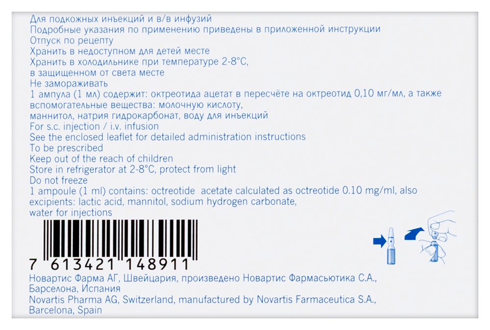- Состав1 мл раствора для внутривенного и подкожного введения содержит: действующее вещество - октреотида ацетат в пересчёте на октреотид 0,10 мг/мл (в форме октреотида ацетата 0,1058 мг/мл); вспомогательные вещества: молочная кислота, маннитол, натрия гидрокарбонат, вода для инъекций.