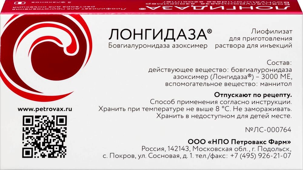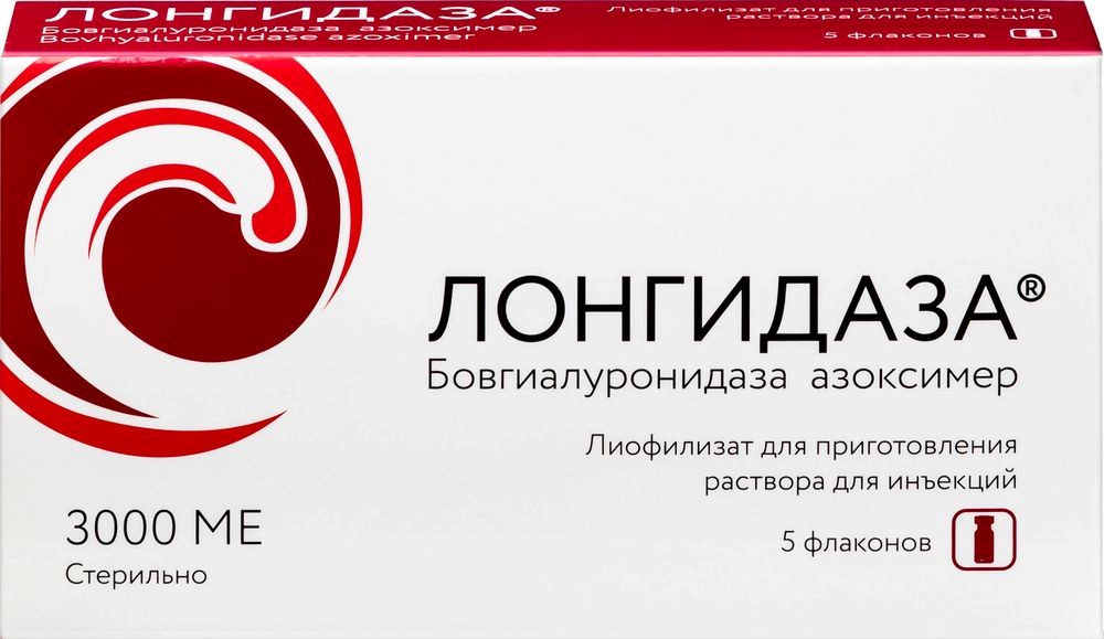 - СоставНа 1 флакон: Действующее вещество: Бовгиалуронидаза азоксимер (Лонгидаза®) 3000 ME; Вспомогательное вещество: маннитол до 20 мг.