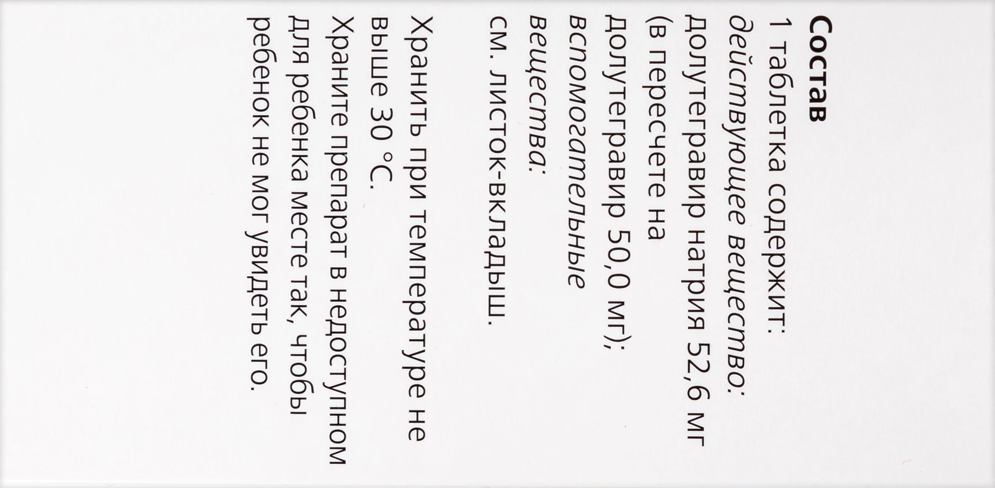- СоставКаждая таблетка содержит: Компонент Количество (мг) Ядро таблетки: Действующее вещество: Долутегравир натрия (в пересчете на долутегравир) 52,6 (50,0) Вспомогательные вещества: Маннитол 145,4 Целлюлоза микрокристаллическая 60,0 Повидон-К29/32 15,0 Карбоксиметилкрахмал натрия 21,0 Натрия стеарилфумарат 6,0 Масса ядра таблетки 300,0 Пленочная оболочка: Опадрай II желтый 9,0 Номинальная масса таблетки 309,0 Состав Опадрая II желтого: Поливиниловый спирт гидролизованный 40,00 Титана диоксид 23,45 Макрогол / полиэтиленгликоль 20,20 Тальк 14,80 Краситель железа оксид желтый 1,55