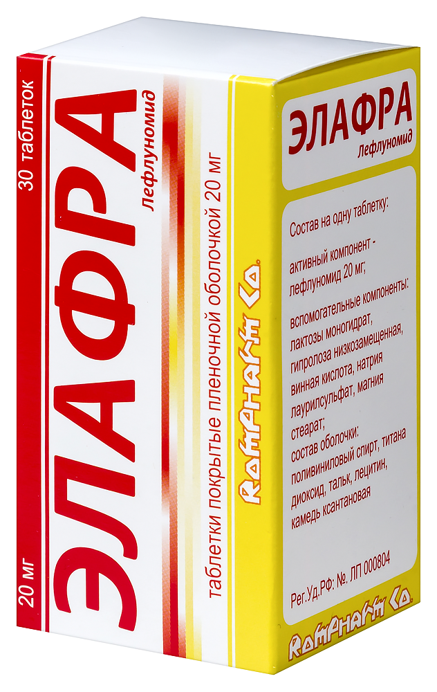- Особые указанияПрепарат ЭЛАФРА может назначаться пациентам только после тщательного медицинского обследования. Поскольку лефлуномид долго сохраняется в организме, переход на прием другого базисного препарата (например, метотрексата) без соответствующего проведения процедуры «отмывания» может увеличить возможность возникновения дополнительного риска даже спустя длительное время после перехода (например, кинетическое взаимодействие, органотоксичность). Аналогичным образом недавнее лечение гепатотоксичными или гематотоксичными препаратами (например, метотрексатом) может привести к увеличе¬нию числа побочных явлений, поэтому начиная лечение лефлуномидом, необходимо тщательно рассмотреть все положительные и отрицательные аспекты, связанные с приемом данного препарата. Перед началом лечения препаратом ЭЛАФРА необходимо помнить о возможном увеличении числа побочных эффектов у пациентов, ранее получавших другие базисные средства для лечения ревматоидного артрита, которые обладают гепато- и гематотоксическими действиями. Поэтому при возникновении подобных случаев токсичности или при переходе к приему другого базисного препарата (например, метотрексата) после лечения лефлуномидом необходимо проводить процедуру «отмывания». Поскольку активный метаболит лефлуномида - А771726 связан с белками и выводится посредством печеночного метаболизма и секреции желчи, предполагается, что концентрация А771726 в плазме крови может повышаться у пациентов с гипопротеинемией. Вследствие длительного Т1/2 активного метаболита лефлуномида - А771726, даже при прекращении лечения лефлуномидом могут возникнуть или сохраняться серьезные нежелательные реакции (например гепатотоксичность, гематотоксичность или аллергические реакции). Если развивается серьезное нежелательное явление, или если потребуется быстрое выведение из организма A771726 по какой-либо другой причине, следует применять колестирамин или активированный уголь, как описано в разделе «Применение при беременности и в период грудного вскармливания», и, при клинической необходимости, продолжить или повторить прием одного из них. При подозрении на тяжелые иммунологические/аллергические реакции для достижения быстрого и эффективного очищения организма может потребоваться более длительное применение колестирамина или активированного угля. Одновременное применение терифлуномида с лефлуномидом не рекомендуется, так как лефлуномид является родственным соединением терифлуномида. Реакции со стороны печени Поскольку активный метаболит лефлуномида - А771726 имеет высокое сродство к белкам и выводится путем метаболизма в печени и секреции с желчью, а также может оказывать гепатотоксическое действие, у пациентов с нарушением функции печени применение лефлуномида противопоказано. У пациентов с заболеванием печени применение лефлуномида не рекомендуется. Сообщалось о редких случаях развития тяжелого поражения печени, в отдель¬ных случаях со смертельным исходом, при лечении лефлуномидом. Большинство этих случаев наблюдалось в течение первых 6 месяцев лечения. Хотя не установлена причинная взаимосвязь этих нежелательных явлений с лефлуномидом, и в большинстве случаев имелось несколько дополнительных подозрительных факторов, точное выполнение рекомендаций по контр