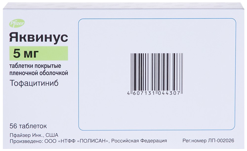 - ПоказанияРевматоидный артрит Яквинус показан для лечения взрослых пациентов с умеренным или тяжелым активным ревматоидным артритом с неадекватным ответом на один или несколько базисных противовоспалительных препаратов (БПВП). Псориатический артрит Яквинус (тофацитиниб) показан для лечения взрослых пациентов с активным псориатическим артритом с неадекватным ответом на один или несколько БПВП. Бляшечный псориаз Яквинус (тофацитиниб) показан для лечения взрослых с хроническим бляшечным псориазом умеренной или тяжелой степени выраженности, когда показана системная терапия или фототерапия. Язвенный колит Яквинус (тофацитиниб) показан для индукционной и поддерживающей терапии взрослых пациентов с умеренным или тяжелым активным язвенным колитом (ЯК) с недостаточным ответом, потерей ответа или непереносимостью кортикостероидов, азатиоприна (АЗТ), 6-меркаптопурина (6-МП) или ингибиторов фактора некроза опухолей (ФНО).