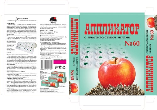 Аппликатор представляет собой изделия с иглами, которые изготовлены из нетоксичной пластмассы и закреплены на плотной гигиенически чистой основе-пленке из полиэтилена, тканного или нетканного полотна при помощи специальной кнопки.