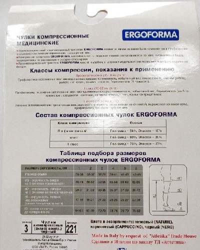 Компрессия трикотажа ERGOFORMA градуированная, максимальная на лодыжке, плавно распределяется по ноге, уменьшаясь к колену и бедру, защищая вены от растяжения и ускоряя отток крови.
