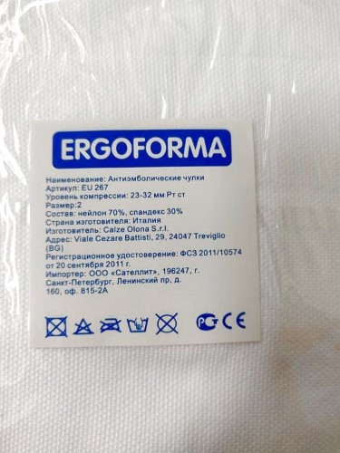 Антиэмболические чулки предназначены для использования во время оперативного вмешательства, во время родов и при длительной неподвижности больных при постельном режиме. Отличительными чертами антиэмболического трикотажа под торговой маркой Ergoforma являются возможность использования чулок в течение трех суток подряд без потери компрессионных свойств, а также возможность санации чулок в горячей воде.