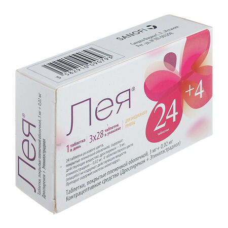Препарат Лея® предназначен для приема внутрь ежедневно в течение 28 дней без перерывов, приблизительно в одно и тоже время, с небольшим количеством воды, в порядке, указанном на упаковке блистера. Прием таблеток из новой упаковки начинается на следующий день после приема последней таблетки из предыдущей упаковки.