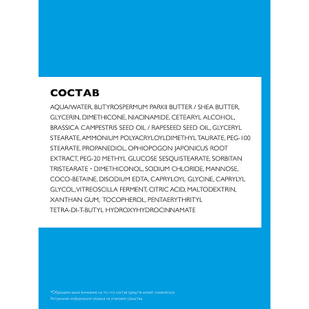 - AQUA/WATER BUTYROSPERMUM PARKII BUTTER / SHEA BUTTER GLYCERIN DIMETHICONE NIACINAMIDE CETEARYL ALCOHOL BRASSICA CAMPESTRIS SEED OIL / RAPESEED SEED OIL GLYCERYL STEARATE AMMONIUM POLYACRYLOYLDIMETHYL TAURATE PEG-100 STEARATE PROPANEDIOL OPHIOPOGON JAPONICUS ROOT EXTRACT PEG-20 METHYL GLUCOSE SESQUISTEARATE SORBITAN TRISTEARATE ∙ DIMETHICONOL SODIUM CHLORIDE MANNOSE COCO-BETAINE DISODIUM EDTA CAPRYLOYL GLYCINE CAPRYLYL GLYCOL VITREOSCILLA FERMENT CITRIC ACID MALTODEXTRIN XANTHAN GUM TOCOPHEROL PENTAERYTHRITYL TETRA-DI-T-BUTYL HYDROXYHYDROCINNAMATE