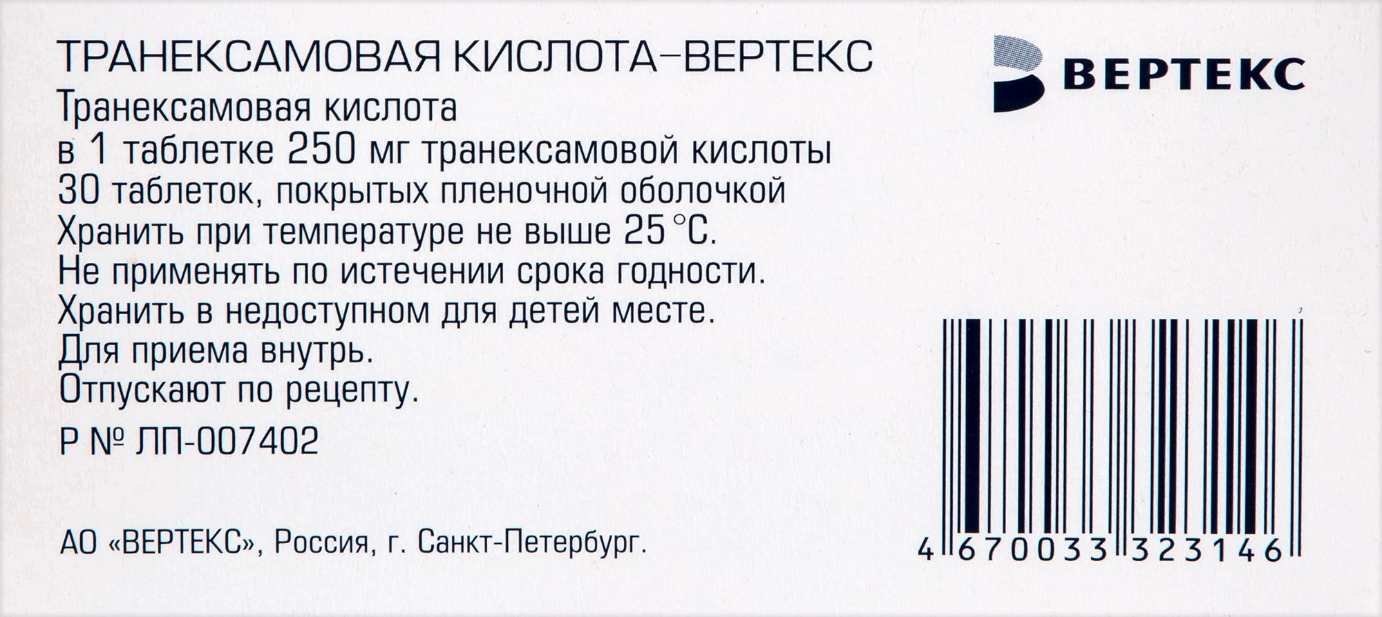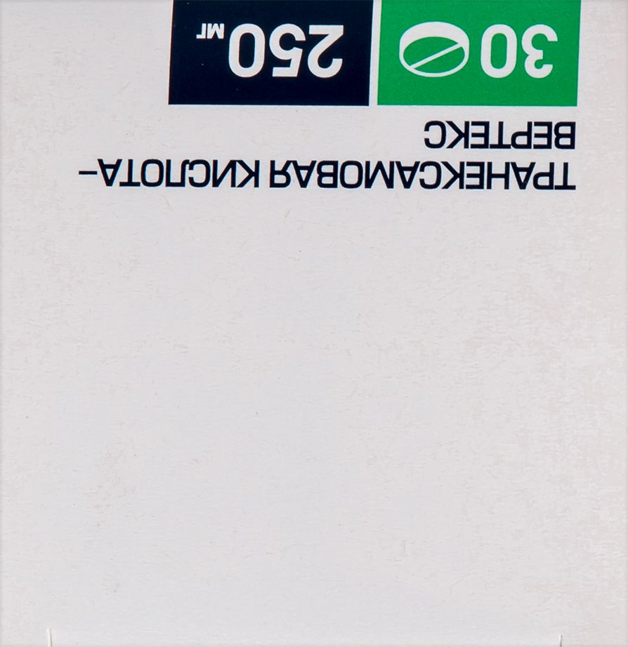 - СоставОдна таблетка содержит: действующее вещество: транексамовая кислота - 250,00 мг; вспомогательные вещества: целлюлоза микрокристаллическая (тип 102), кроскармеллоза натрия, повидон К-30, крахмал прежелатинизированный, тальк, натрия стеарилфумарат, кремния диоксид коллоидный; пленочная оболочка: [гипромеллоза, тальк, титана диоксид, макрогол 4000 (полиэтиленгликоль 4000)] или [сухая смесь для пленочного покрытия, содержащая гипромеллозу, тальк, титана диоксид, макрогол 4000 (полиэтиленгликоль 4000)].