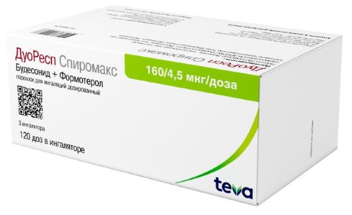 - Способ применения и дозыДля ингаляционного применения. 160/4,5 мкг/доза Бронхиальная астма Подбор дозы препаратов, входящих в состав препарата ДуоРесп Спиромакс, происходит индивидуально и в зависимости от степени тяжести заболевания. Это необходимо учитывать не только при начале лечения комбинированными препаратами, но и при изменении поддерживающей дозы препарата. Пациенты должны находиться под постоянным контролем врача для адекватного подбора дозы препарата ДуоРесп Спиромакс. ДуоРесп Спиромакс можно применять в соответствии с различными подходами к терапии: A. ДуоРесп Спиромакс для купирования приступов/симптомов с противовоспалительным действием (пациенты с бронхиальной астмой легкой степени тяжести). B. ДуоРесп Спиромакс в качестве поддерживающей терапии и для купирования приступов/симптомов с противовоспалительным действием. В качестве альтернативы, ДуоРесп Спиромакс можно применять в виде терапии в фиксированной дозе: C. ДуоРесп Спиромакс в качестве поддерживающей терапии (фиксированная доза). А. ДуоРесп Спиромакс для купирования приступов/симптомов с противовоспалительным действием (пациенты с бронхиальной астмой легкой степени тяжести) ДуоРесп Спиромакс принимается по требованию для облегчения симптомов бронхиальной астмы при их развитии и для профилактики бронхоконстрикции, вызванной аллергенами или физической нагрузкой (или для профилактики симптомов в ситуациях, по оценке пациента способных спровоцировать приступ бронхиальной астмы). Формотерол, действующее вещество препарата ДуоРесп Спиромакс, обеспечивает быстрое начало действия (в течение 1-3 минут) с длительной бронходилатацией (как минимум 12 часов после приема однократной дозы) при обратимой обструкции дыхательных путей. Пациенту необходимо постоянно иметь при себе ДуоРесп Спиромакс для облегчения симптомов. Врачу следует обсудить экспозицию аллергена и объем физической нагрузки с пациентом и учитывать их при рекомендации частоты приема препарата. Взрослые (18 лет и старше): Пациенты должны принимать 1 ингаляцию по требованию при развитии симптомов и для профилактики бронхоконстрикции, вызванной аллергенами или физической нагрузкой, для контроля бронхиальной астмы. При дальнейшем нарастании симптомов в течение нескольких минут назначается еще 1 дополнительная ингаляция, но не более 6 ингаляций для купирования 1 приступа. Обычно не требуется более 8 ингаляций в сутки, однако можно увеличить число ингаляций до 12 в сутки на непродолжительное время. Пациентам, получающим более 8 ингаляций в сутки, рекомендовано обратиться за медицинской помощью для повторной оценки состояния и пересмотра терапии бронхиальной астмы. Требуется тщательный контроль за дозозависимыми побочными эффектами у пациентов, использующих большое количество ингаляций по требованию. В. ДуоРесп Спиромакс в качестве поддерживающей терапии и для купирования приступов/симптомов с противовоспалительным действием При необходимости поддерживающей терапии комбинацией ингаляционного глюкокортикостероида и агониста бета2-адренорецепторов длительного действия, пациент может принимать ДуоРесп Спиромакс в качестве поддерживающей терапии и в дополнение для купирования приступов/симптомов с противовоспалительным действием. Пациенту необходимо постоянно иметь п