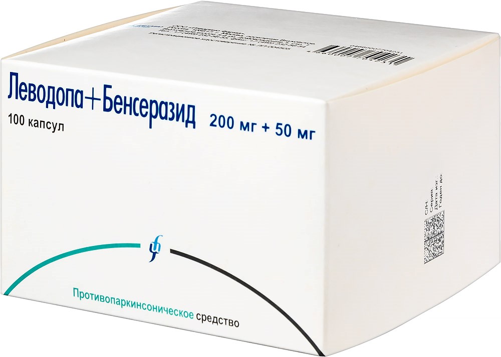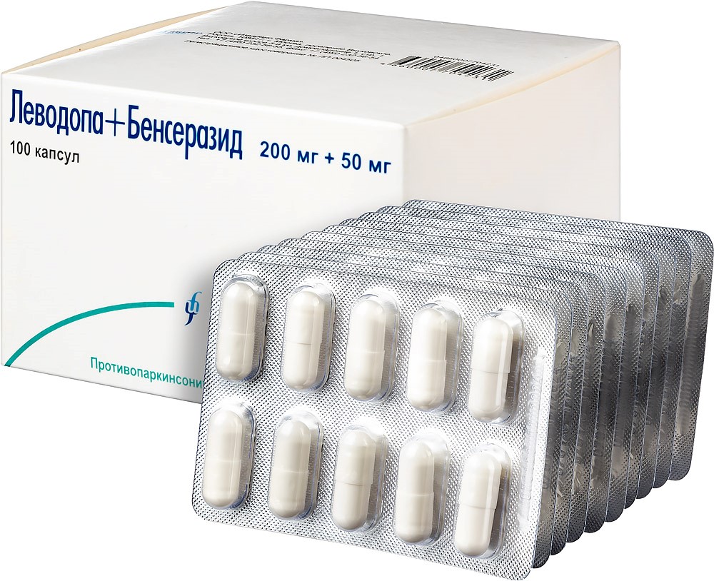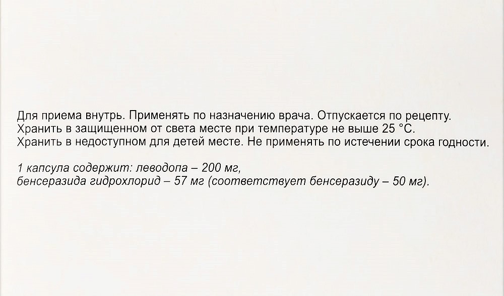 - Состав1 капсула содержит: Действующие вещества: леводопа - 200,0 мг, бенсеразида гидрохлорид - 57,0 мг (в пересчете на бенсеразид - 50,0 мг). Вспомогательные вещества: натрия лаурилсульфат - 1,0 мг, целлюлоза микрокристаллическая (тип 102) - 64,0 мг, кальция гидрофосфат - 150,0 мг, кремния диоксид коллоидный - 15,0 мг, кросповидон - 10,0 мг, магния стеарат - 3,0 мг. Состав корпуса капсулы: титана диоксид - 2 %, желатин - до 100 %. Состав крышечки капсулы: титана диоксид - 2 %, желатин - до 100 %. Свернуть