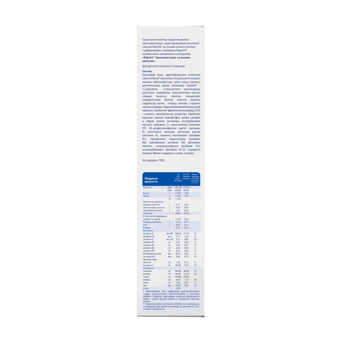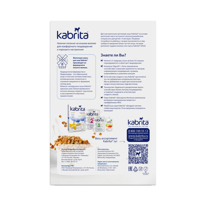 • Технология «бережного расщепления зерна» облегчает пищеварение, позволяет сохранить естественную сладость злаков. Благодаря этой технологии каши Kabrita® имеют воздушную, нежную структуру и идеально разводятся в воде.