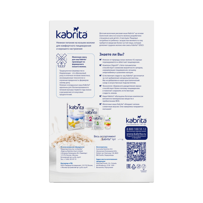 • Технология «бережного расщепления зерна» облегчает пищеварение, позволяет сохранить естественную сладость злаков. Благодаря этой технологии каши Kabrita® имеют воздушную, нежную структуру и идеально разводятся в воде.