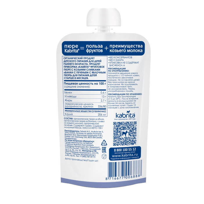 Пюре Kabrita® - спелые бананы, сладкое яблоко и вкусное детское печенье в сочетании с нежными сливками козьего молока.