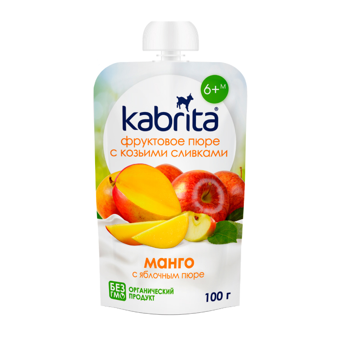 Пюре Kabrita® - вкусное спелое манго и сладкое яблоко в сочетании с нежными сливками козьего молока.