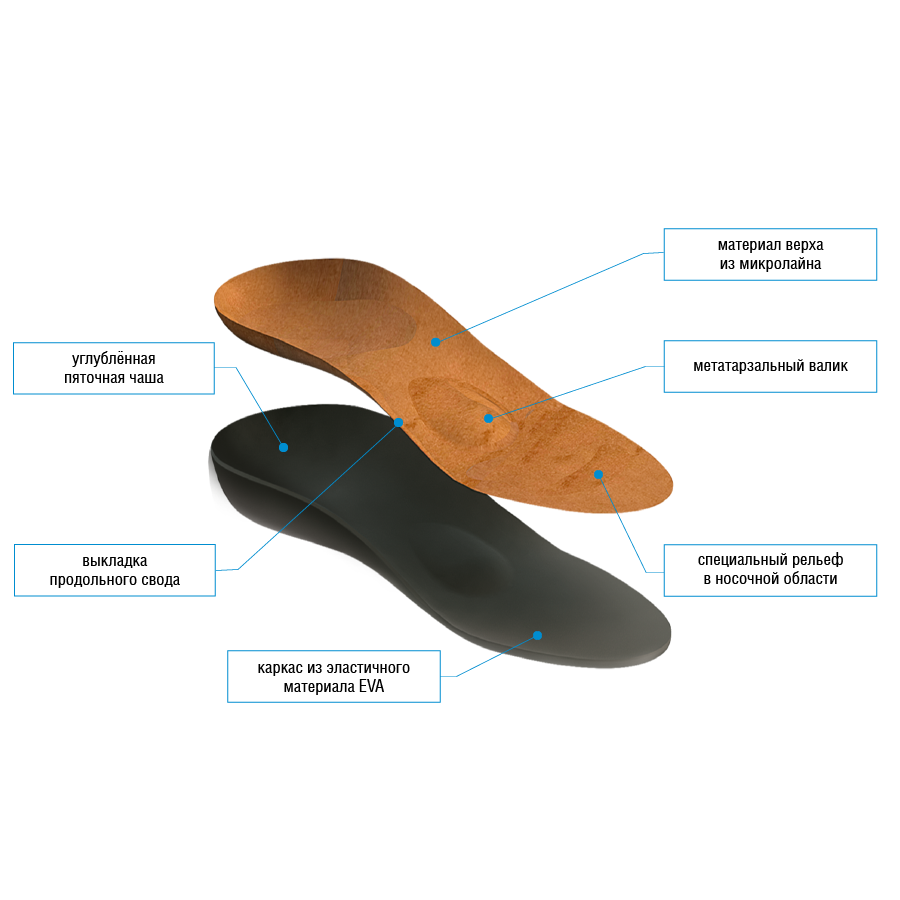 Благодаря специальному рельефу, расположенному в носочной части стельки, создается дополнительная подвижность, уменьшается нагрузка на проблемные зоны в переднем отделе стопы.