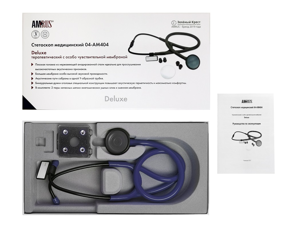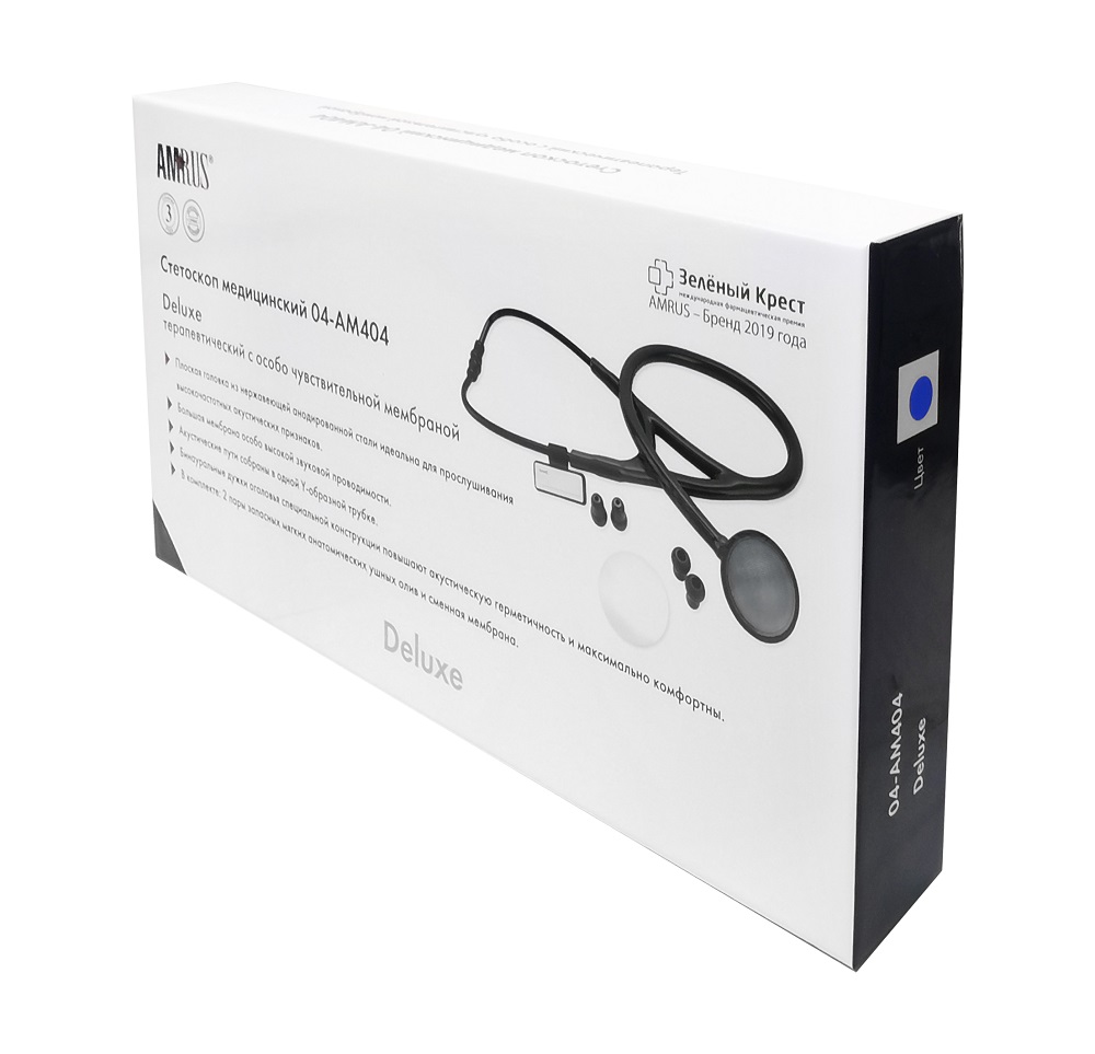 Стетоскоп медицинский 04-АМ404, терапевтический, категории Deluxe, с особо чувствительной мембраной, предназначен для выслушивания (аускультации) сердца, легких и других внутренних органов у взрослых пациентов.