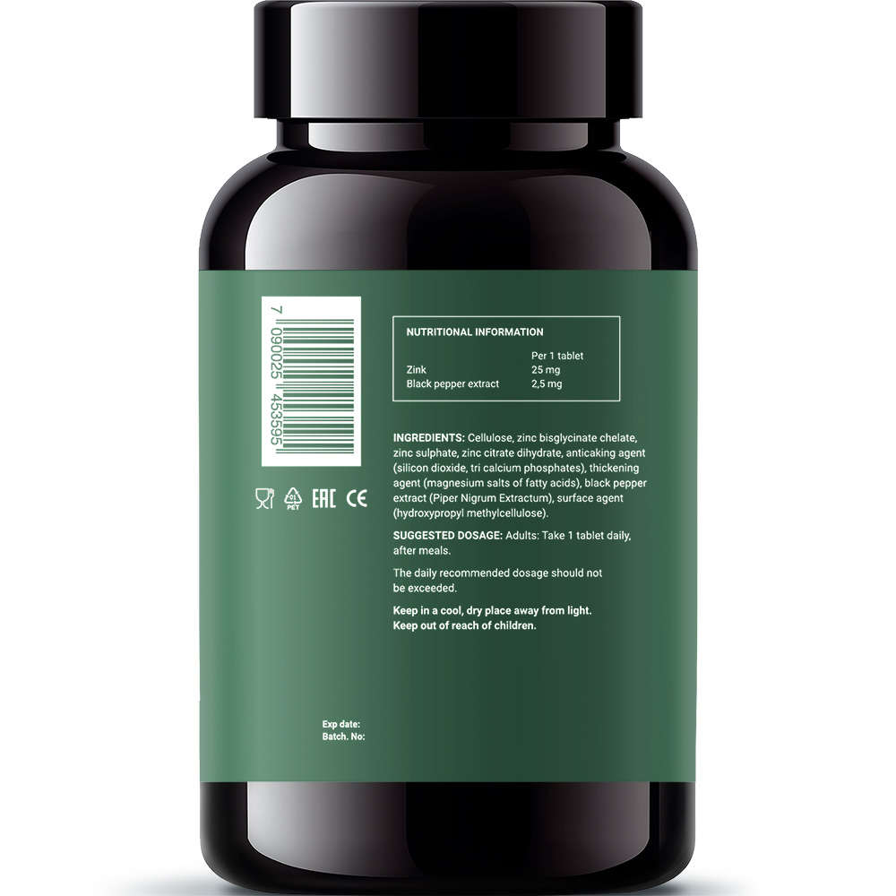 Экстракт черного перца содержит алкалоид пиперин, который значимо повышает усвоение цинка организмом, усиливает эффективность его действия. Кроме того, пиперин обладает антиоксидантной активностью, защищая клетки от окислительного стресса.
