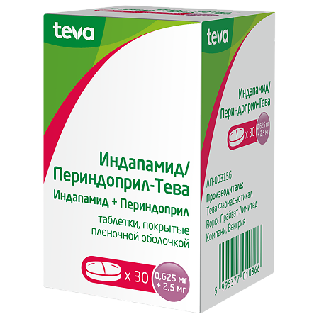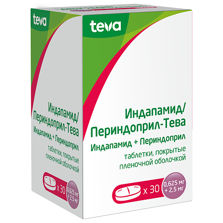 действующие вещества: индапамид 0,625 мг/1,25 мг; периндоприла тозилат 2,50 мг/5,00 мг, что соответствует периндоприлу 1,7 мг/3,4 мг;
