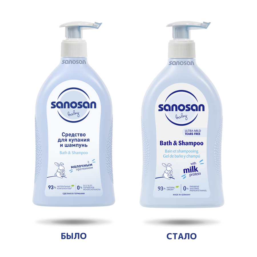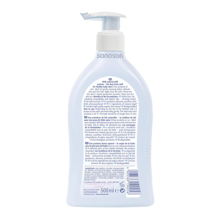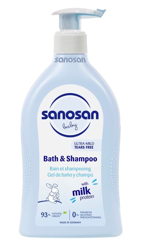 САНОСАН СРЕДСТВО ДЛЯ КУПАНИЯ И ШАМПУНЬ - тщательно очищает кожу и тонкие волосы малыша, не высушивая их, благодаря мягким моющим компонентам растительного происхождения.