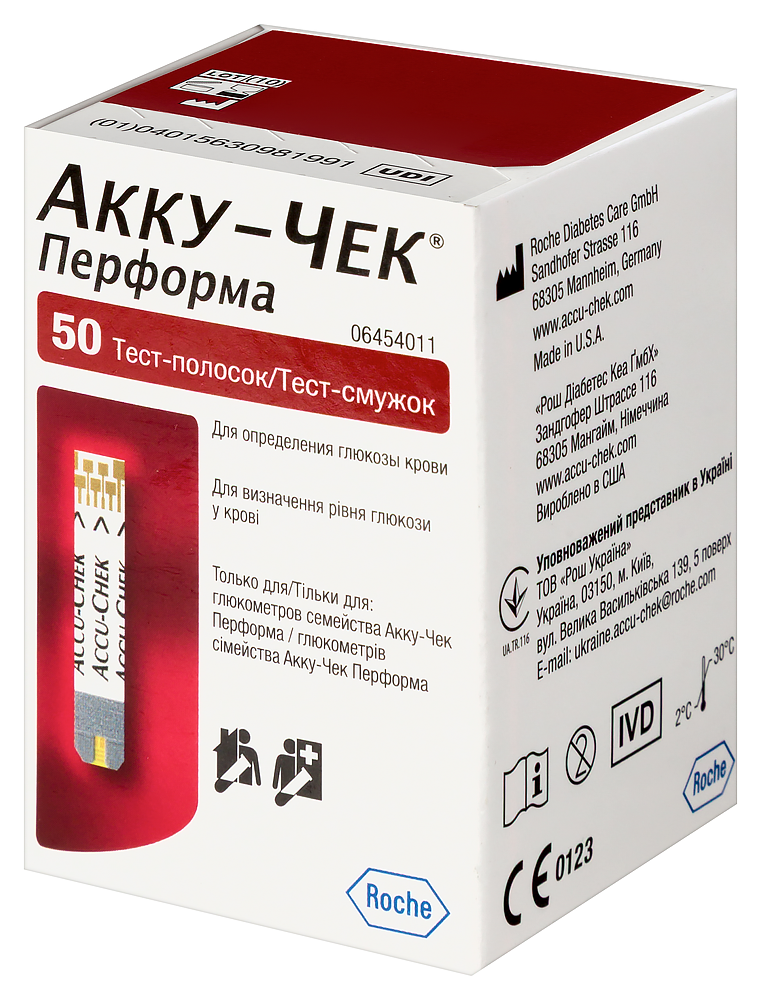 Предназначены для применения с глюкометрами Акку-Чек Перформа, Акку-Чек Перформа Нано и глюкопультом Акку-Чек Перформа Комбо для количественного определения уровня глюкозы в свежей капиллярной цельной крови в качестве средства мониторинга эффективности гликемического контроля.