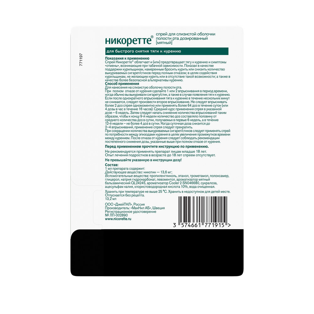 - Способ применения и дозыДля нанесения на слизистую оболочку полости рта. Пациент должен сделать все возможное, чтобы окончательно бросить курить при лечении спреем Никоретте®. Взрослые старше 18 лет Спрей Никоретте® следует применять в тот момент, когда возникает непреодолимое желание закурить. После подготовки спрея к использованию (см. ниже Инструкцию по использованию при первом применении спрея) поднесите наконечник спрея как можно ближе к открытому рту. Нажмите на дозатор сверху, высвободив таким образом одну дозу препарата в полость рта; следует избегать попадания спрея на губы. Чтобы исключить попадание вещества в дыхательные пути, в момент нажатия на дозатор не следует совершать вдох. Для достижения наилучших результатов не сглатывайте слюну в течение нескольких секунд после впрыскивания. Во время использования спрея прием пищи и жидкости не рекомендуется. При появлении симптомов передозировки (см. раздел «Передозировка») применение препарата необходимо немедленно прекратить. Полный отказ от курения Спрей Никоретте® следует использовать во всех случаях возникновения тяги к курению или для недопущения тяги в ситуациях, которые могут ее провоцировать. Курильщики, желающие или способные отказаться от курения немедленно, должны сразу заменить выкуривание сигарет спреем Никоретте® и, как только представится возможность, снизить количество впрыскиваний до их полного прекращения. При полном отказе от курения сделайте 1 или 2 впрыскивания в период времени, когда обычно вы выкуривали сигарету, а также в случае появления тяги к курению. Если после однократного впрыскивания тяга к курению в течение нескольких минут не снижается, следует произвести второе впрыскивание. Если требуются две дозы, то последующее применение спрея может состоять из 2 последовательных впрыскиваний. Каждый час разрешается принимать не более 4 дозированных впрыскиваний спрея. Не следует впрыскивать более 2 доз спрея одномоментно или применять более 64 доз в течение суток (или 4 дозы в час в течение 16 часов). Каждый флакон содержит не менее 150 доз. Средний курс применения спрея в указанной дозе – 6 недель. Затем следует начать снижение количества впрыскиваний таким образом, чтобы к концу 9-й недели количество доз составляло половину от среднего количества доз в сутки, получаемых в первые 6 недель, а в течение 12-й недели – не более 4 доз в сутки. Когда суточная доза снизится до 2–4 впрыскиваний, применение спрея следует прекратить. После окончания терапии для предотвращения возврата к курению пациенты могут применять спрей Никоретте® при непреодолимом желании курить. В таких ситуациях можно сделать 1 впрыскивание, а в случае, если после однократного впрыскивания тяга к курению в течение нескольких минут не снижается, следует произвести второе впрыскивание. При этом не следует превышать 4 дозированных впрыскиваний в сутки. Регулярное применение спрея более 6 месяцев обычно не рекомендуется, однако некоторым пациентам может потребоваться более длительная терапия, чтобы не возобновить курение. Сокращение количества выкуриваемых сигарет Курильщикам, желающим снизить количество выкуриваемых сигарет, следует применять спрей по потребности между эпизодами курения в целях увеличения промежутков времени между курением и с целью как можно больш