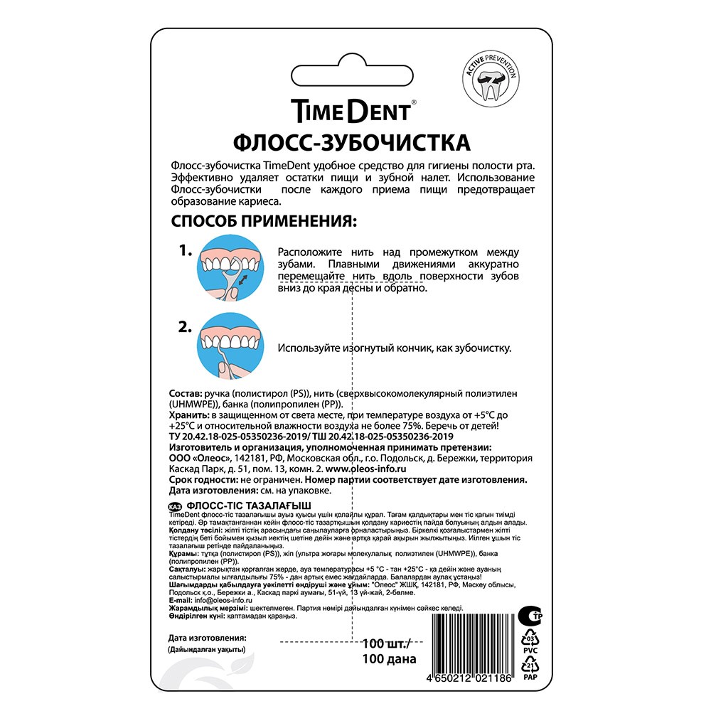 Ежедневное использование зубной нити Time Dent помогает удалять зубной налет и бактерии, провоцирующие возникновение заболеваний десен.
