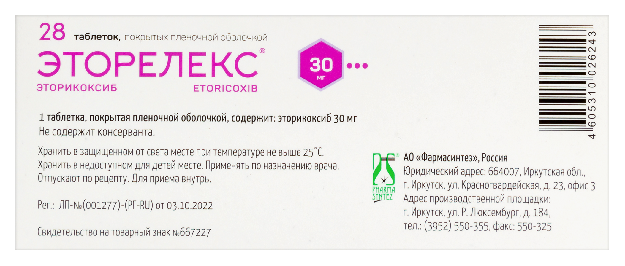 - СоставДействующим веществом является эторикоксиб Каждая таблетка, покрытая пленочной оболочкой, содержит 30 мг эторикоксиба. Прочими ингредиентами (вспомогательными веществами) являются: Ядро: гипромеллоза Е15, кальция гидрофосфата дигидрат, кроскармеллоза натрия, кремния диоксид коллоидный, натрия стеарилфумарат, целлюлоза микрокристаллическая 200. Пленочная оболочка: гипромеллоза Е15, коповидон (Коллидон VA64), макрогол 6000, тальк, титана диоксид. Свернуть