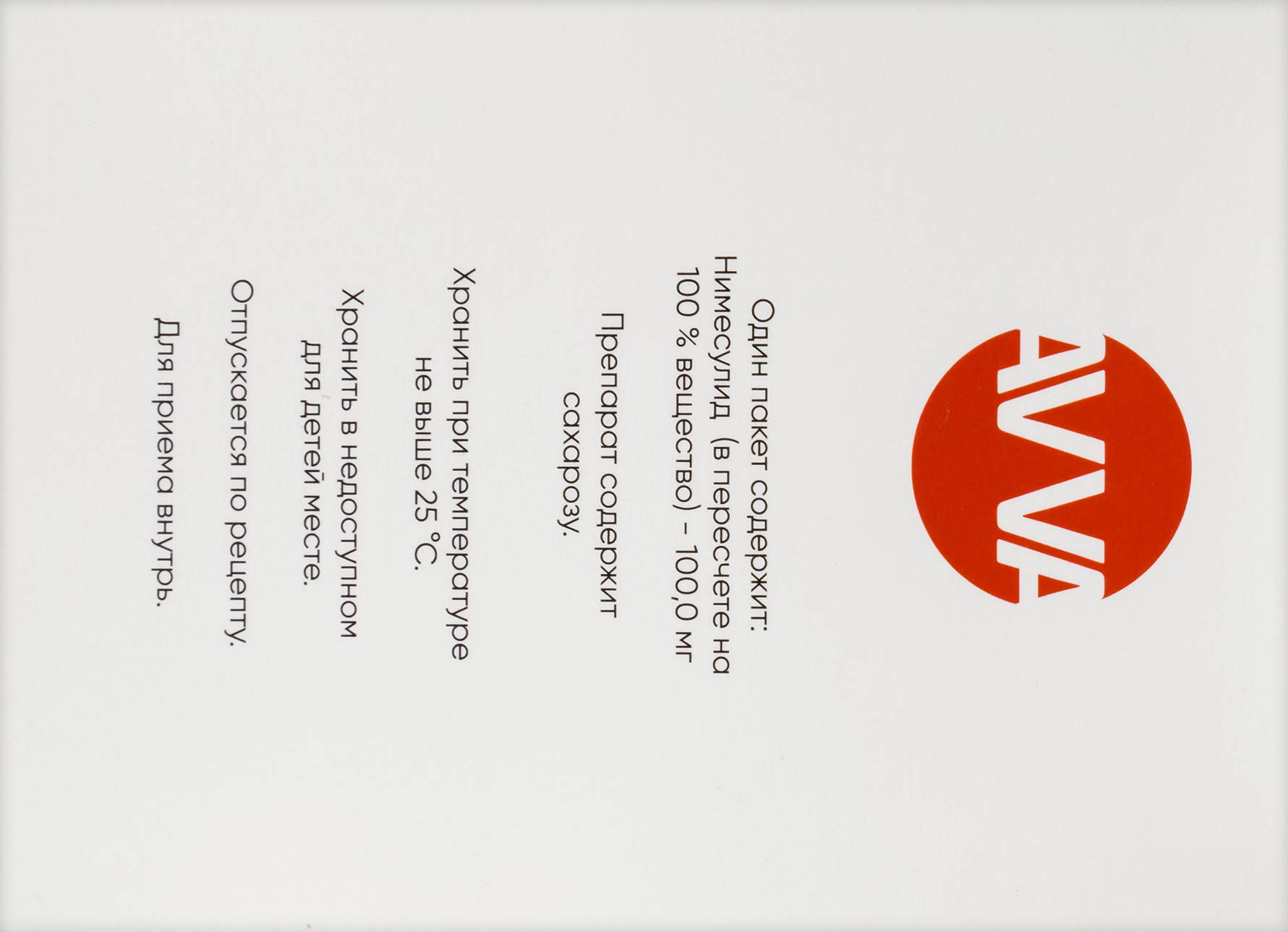 - СоставОдин пакет содержит: Действующее вещество: нимесулид (в пересчете на 100 % вещество) 100,0 мг; вспомогательные вещества: ароматизатор апельсиновый - 42,0 мг, лимонная кислота - 30,0 мг, мальтодекстрин - 15,0 мг, макрогола цетостеарат - 8,0 мг, сахароза - до массы 2000,0 мг.