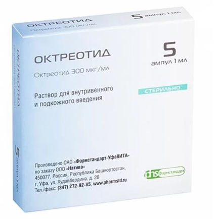 - Октреотид - синтетический октапептид, производное естественного гормона соматостатина, обладает сходными с ним фармакологическими эффектами, но со значительно большей продолжительностью действия. Октреотид подавляет как патологически повышенную секрецию гормона роста (ГР), так и вызываемую аргинином,