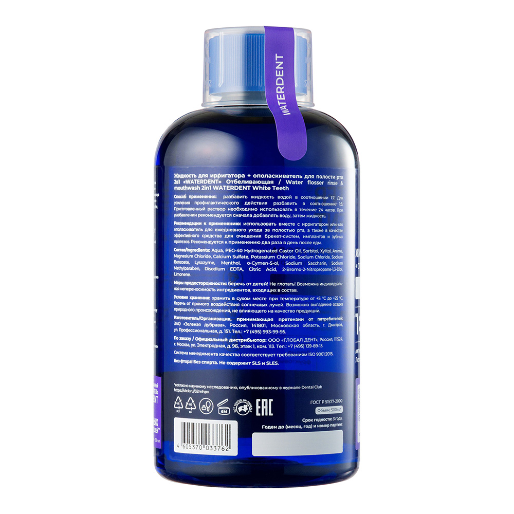 Жидкость для ирригатора + ополаскиватель для полости рта 2в1 «WATERDENT» Отбеливающая бережно осветляет эмаль, предотвращает образование зубного налета и защищает от кариеса.