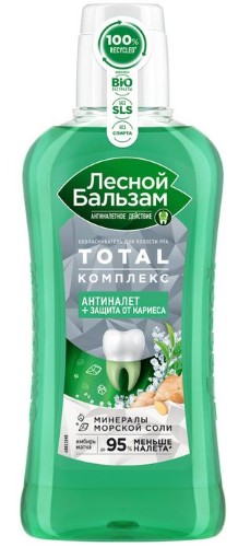 Используй ополаскиватель Лесной бальзам TOTAL Комплекс после каждой чистки зубов и избавься от налета в два счета! Он поможет значимо улучшить домашнюю гигиену полости рта, а именно1: