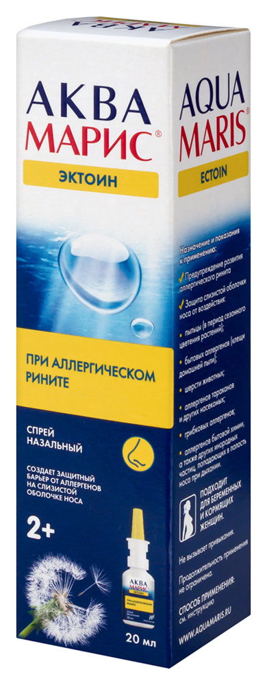 Раствор натуральной морской соли, входящий в состав Аква Марис® Эктоин, способствует механическому удалению аллергенов с поверхности слизистой оболочки носа и очищает ее поверхность от осевшей уличной и домашней пыли. Микроэлементы и минералы морской соли улучшают функцию мерцательного эпителия, оказывают противовоспалительное и восстановительное действие на слизистую оболочку полости носа.