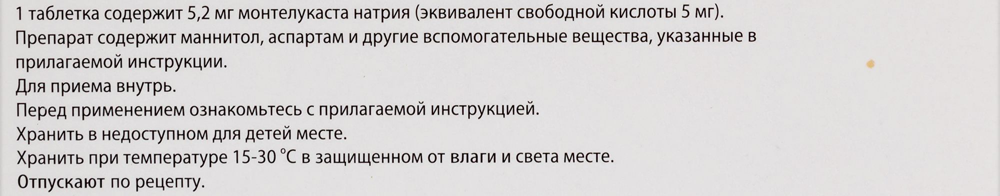 - Состав1 таблетка жевательная содержит: Активное вещество: монтелукаст натрия 5,2 мг (эквивалент 5,0 мг свободной кислоты). Вспомогательные вещества: маннитол 201,35 мг, целлюлоза микрокристаллическая 66,0 мг, гипролоза (гидроксипропилцеллюлоза) 9,0 мг, железа оксид красный 0,45 мг, натрия кроскармеллоза 9,0 мг, вишневый ароматизатор 4,5 мг, аспартам 1,5 мг, магния стеарат 3,0 мг.
