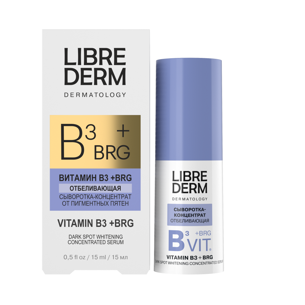 ЛИБРИДЕРМ BRG+ВИТАМИН В3 СЫВОРОТКА-КОНЦЕНТРАТ ОТБЕЛИВАЮЩАЯ ОТ ПИГМЕНТНЫХ ПЯТЕН ТОЧЕЧНОГО НАНЕСЕНИЯ - для всех типов кожи.