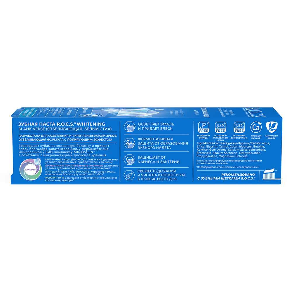 Дополнительно усиленная микрочастицами диоксида кремния формула этой зубной пасты, основанная на комплексе MINERALIN®, обладает выраженными полирующими и придающими блеск эмали зубов свойствами.