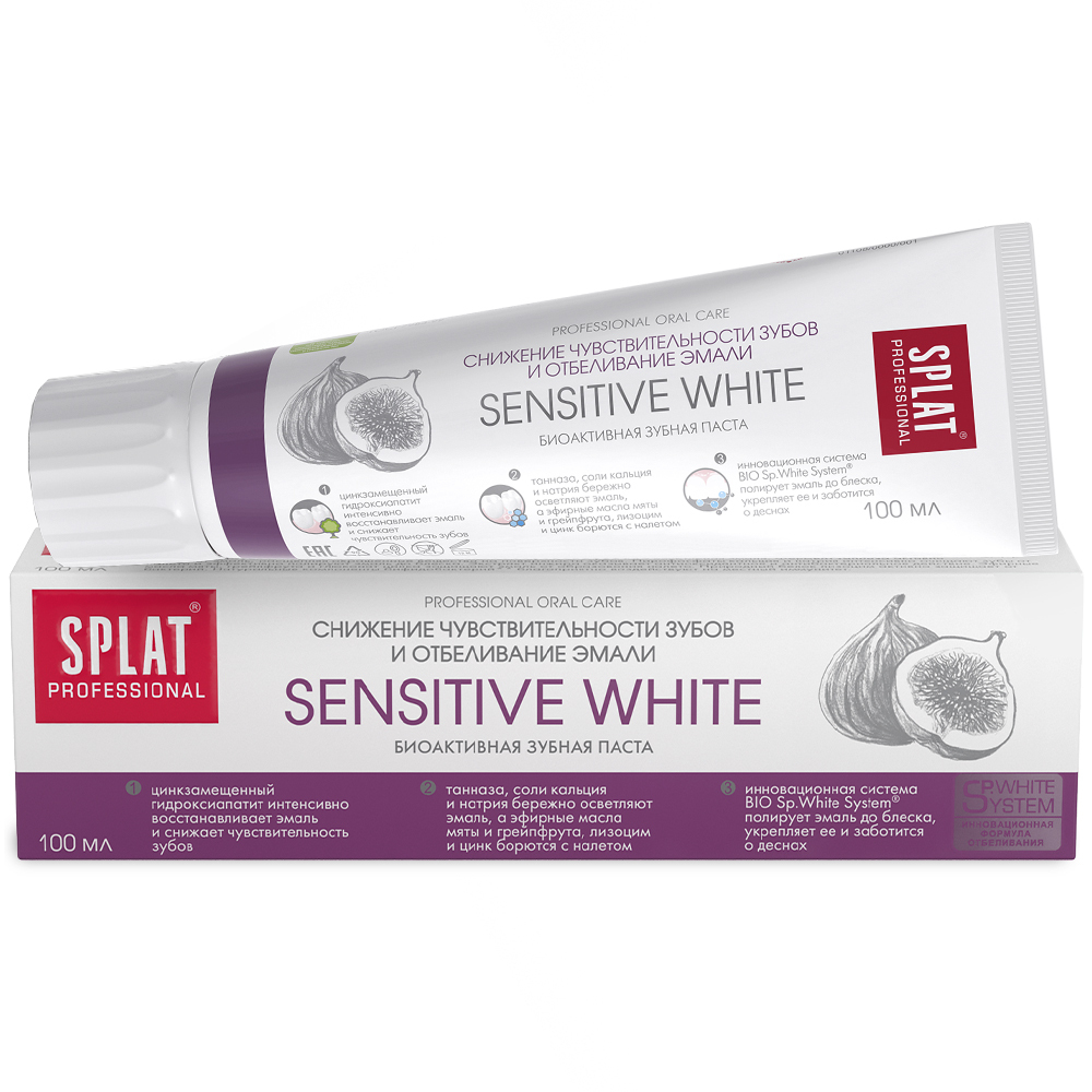 Splat Professional СЕНСИТИВ УАЙТ- эффективная осветляющая зубная паста для людей с повышенной чувствительностью зубов. В состав зубных паст СЕНСИТИВ УАЙТ входит система безопасного отбеливания BIO SP.White System®.