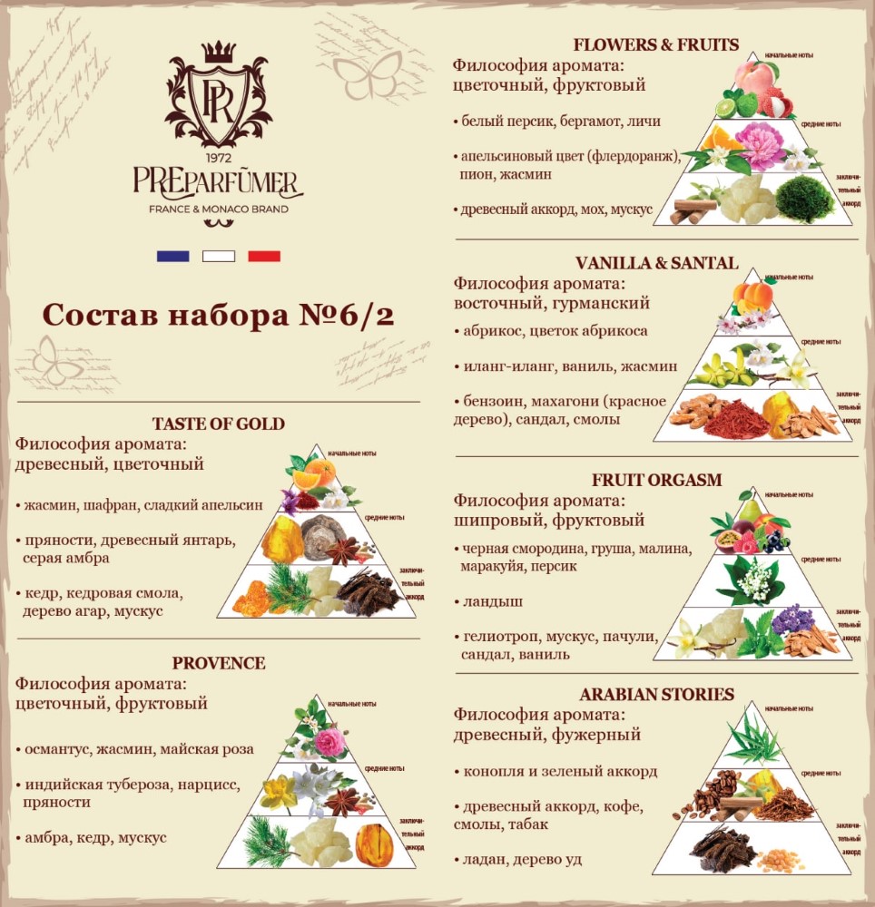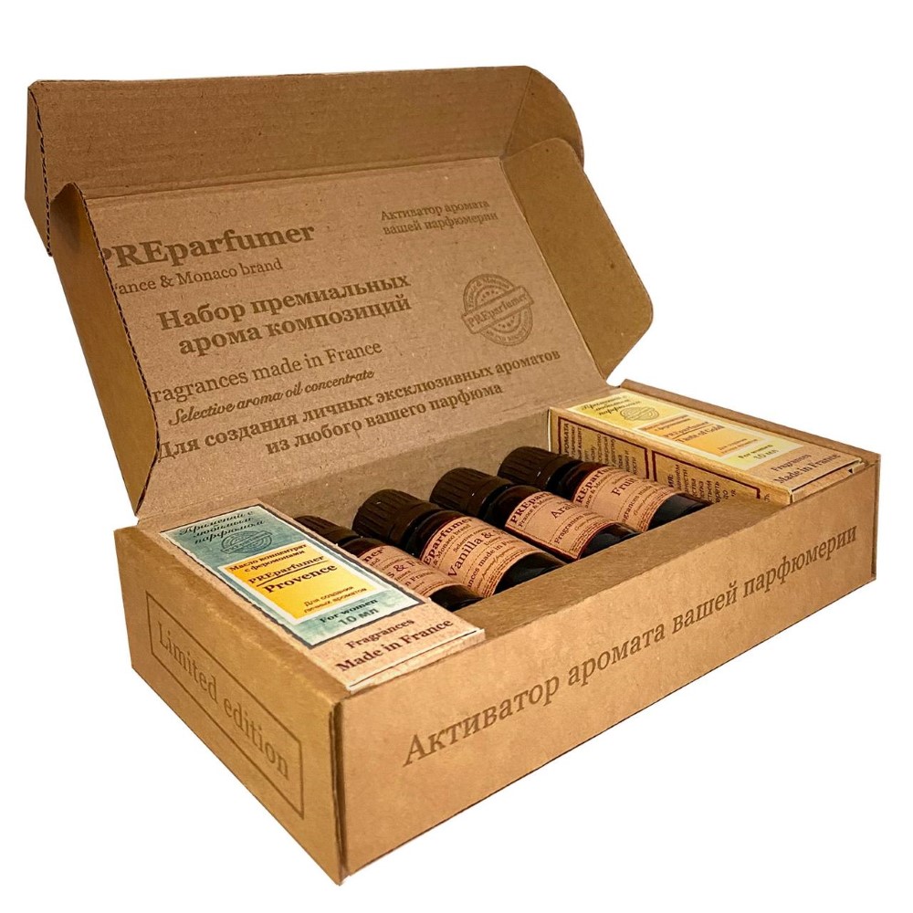 Подарочный набор «France&Monaco» от французского бренда PREparfumer состоит из шести премиальных арома композиций: «TASTE OF GOLD», «PROVENCE», «FLOWERS & FRUITS», «VANILLA & SANTAL», «FRUIT ORGASM», «ARABIAN STORIES».